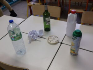 Dans notre classe, c’est Laurent qui a mené l’activité et il a montré quelques déchets de différentes matières : du bois, du papier, du verre, du plastique