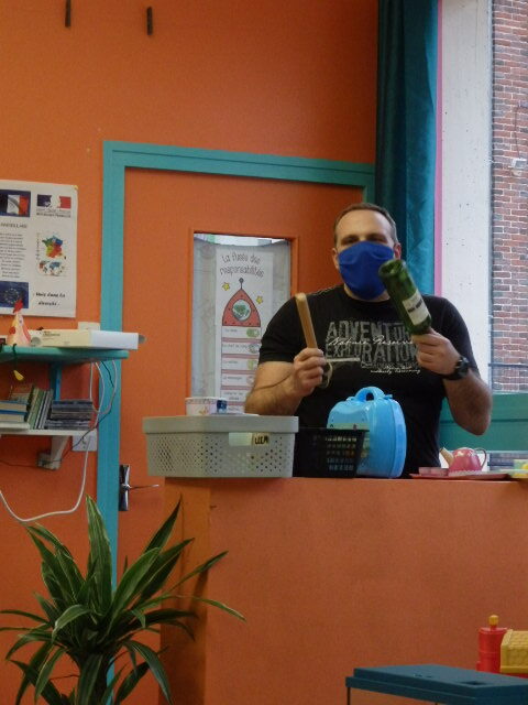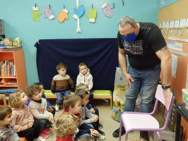 Laurent CHIESA, responsable du service déchets de la CDC des Vallées d’Auge et du Merlerault est venu à l’école avec une collègue et ils sont intervenus dans différentes classes. En maternelle, ils ont proposé une animation sur les déchets de nos
