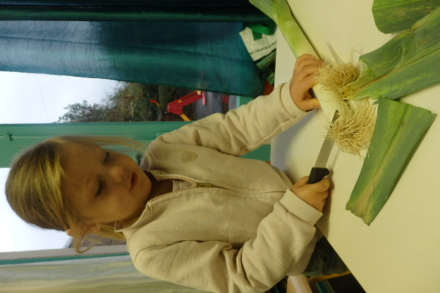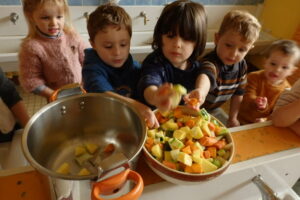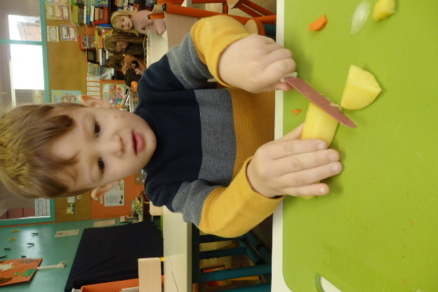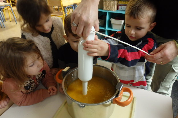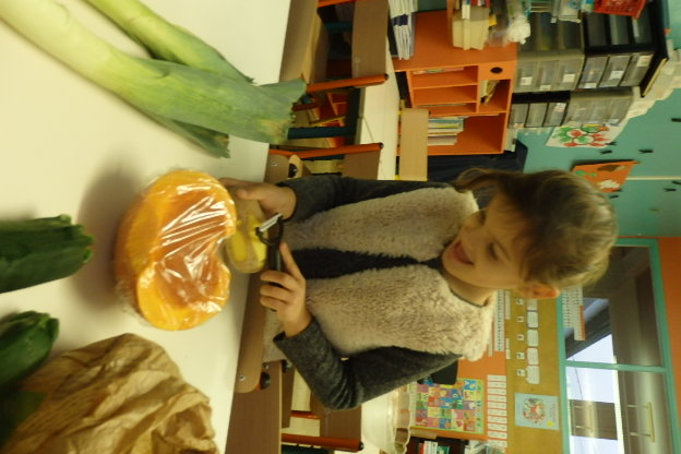 Il a fallu éplucher tous les légumes : des pommes de terre, des carottes, un gros oignon, des courgettes, un morceau de potimarron, des poireaux. Puis nous les avons coupés en petits morceaux et nous les avons bien lavés avant de les mettre dans la cocotte minute avec de l’eau, du sel et du poivre. Une fois cuite, nous avons mixé la soupe avant de la déguster ! Tout le monde a goûté et certains enfants en ont même repris plusieurs fois tellement ils l’ont trouvée bonne.