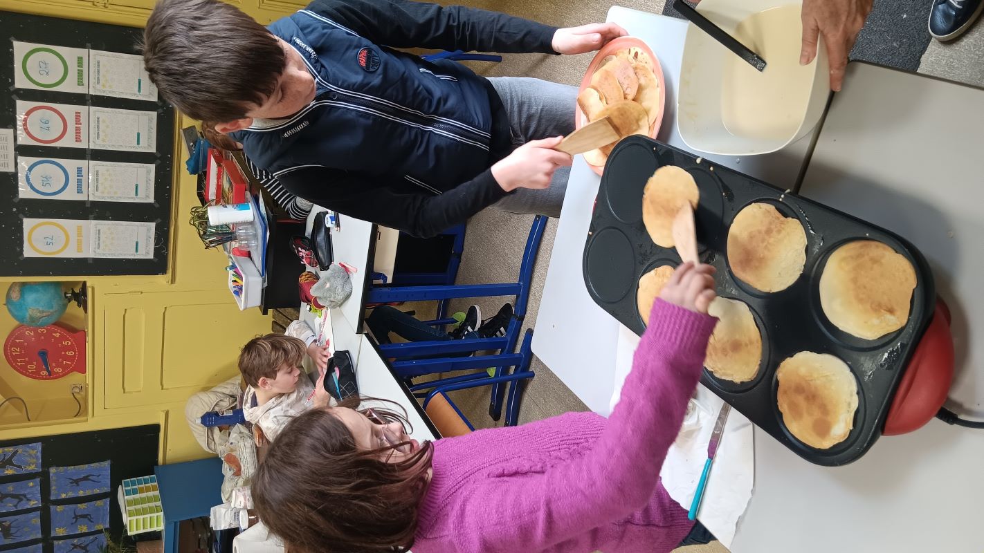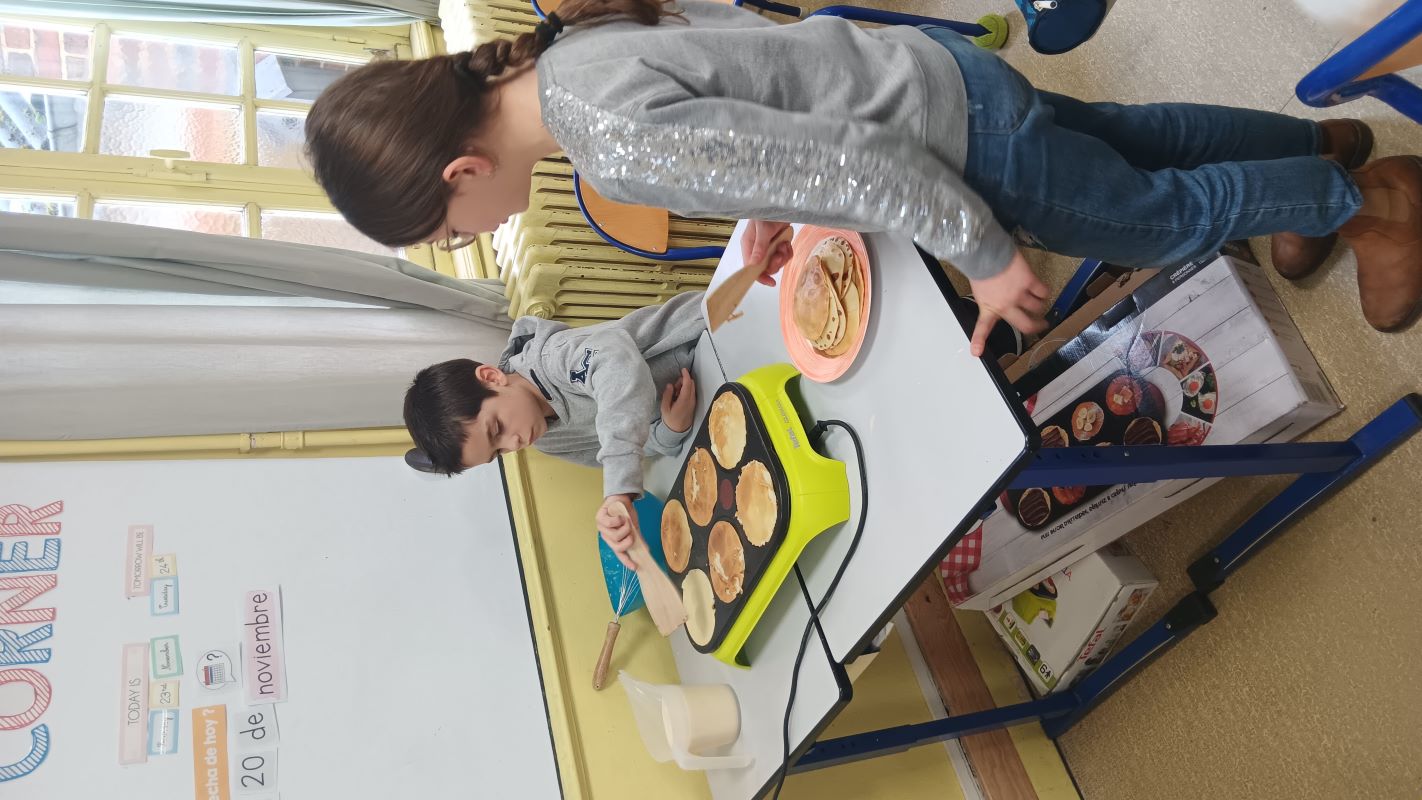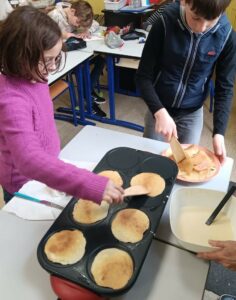 Nous avons fait la pâte à crêpes par petits groupes et nous les avons ensuite fait cuire. En fin de journée, nous avons rejoint la classe de CP de Mme Mannella pour partager nos crêpes avec eux et déguster celles qu’ils ont eux aussi préparées. Un régal !