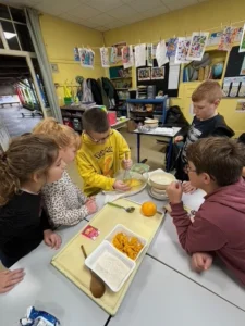Jeudi 17 octobre, nous avons cuisiné en classe. Nous avons fait un gâteau au potiron. Nous avons dû peser, mesurer et mélanger les ingrédients. Pour bien les réussir, il fallait aussi suivre la recette.