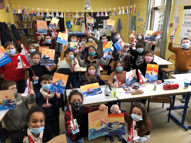 Durant cette période, nous avons continué de suivre le Vendée Globe. Nos skippers sont tout arrivés avant les vacances ! Nous avons donc fabriqué nos voiliers qui sont repartis à la maison. En arts visuels, nous avons fabriqué de jolis voiliers sur l’eau grâce à plusieurs techniques différentes ! Nous avons utilisé de l’aquarelle, de la peinture et nos mains pour faire les voiliers en origami. C’était amusant, mais nous avons dû nous concentrer !