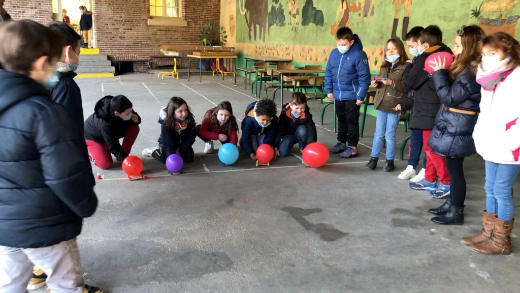 Sous le préau, nous avons fait des courses de voiture. Nous nous sommes aperçu que plus le ballon était gonflé et plus la voiture allait loin !