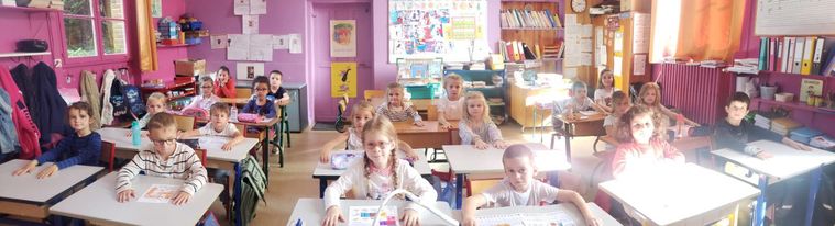 Voici la classe de Cp ! Nous sommes 20 élèves et nous avons deux maîtresses : Mme Levillain le mardi et Mme Mannella les autres jours de la semaine. Nous voyons aussi d’autres adultes puisque nous allons faire de l’informatique avec Aline et nous travaillons tous les jours avec Sophie en petits groupes. De temps en temps, Irène vient nous aider en classe.