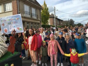 Ce week-end, nous avons participé au défilé de la foire de la pomme avec l’école. Le thème de notre char était le carnaval des animaux. Nous étions déguisés en animaux. Il y avait des poissons, des lions, des vaches, des paons, des cygnes, des poules, des kangourous et ânes. Puis, nous avons défilé dans la ville en donnant la main aux petits. Les maîtresses aussi étaient déguisées.