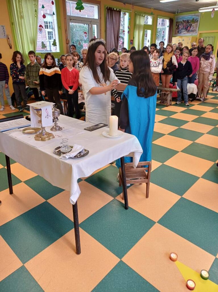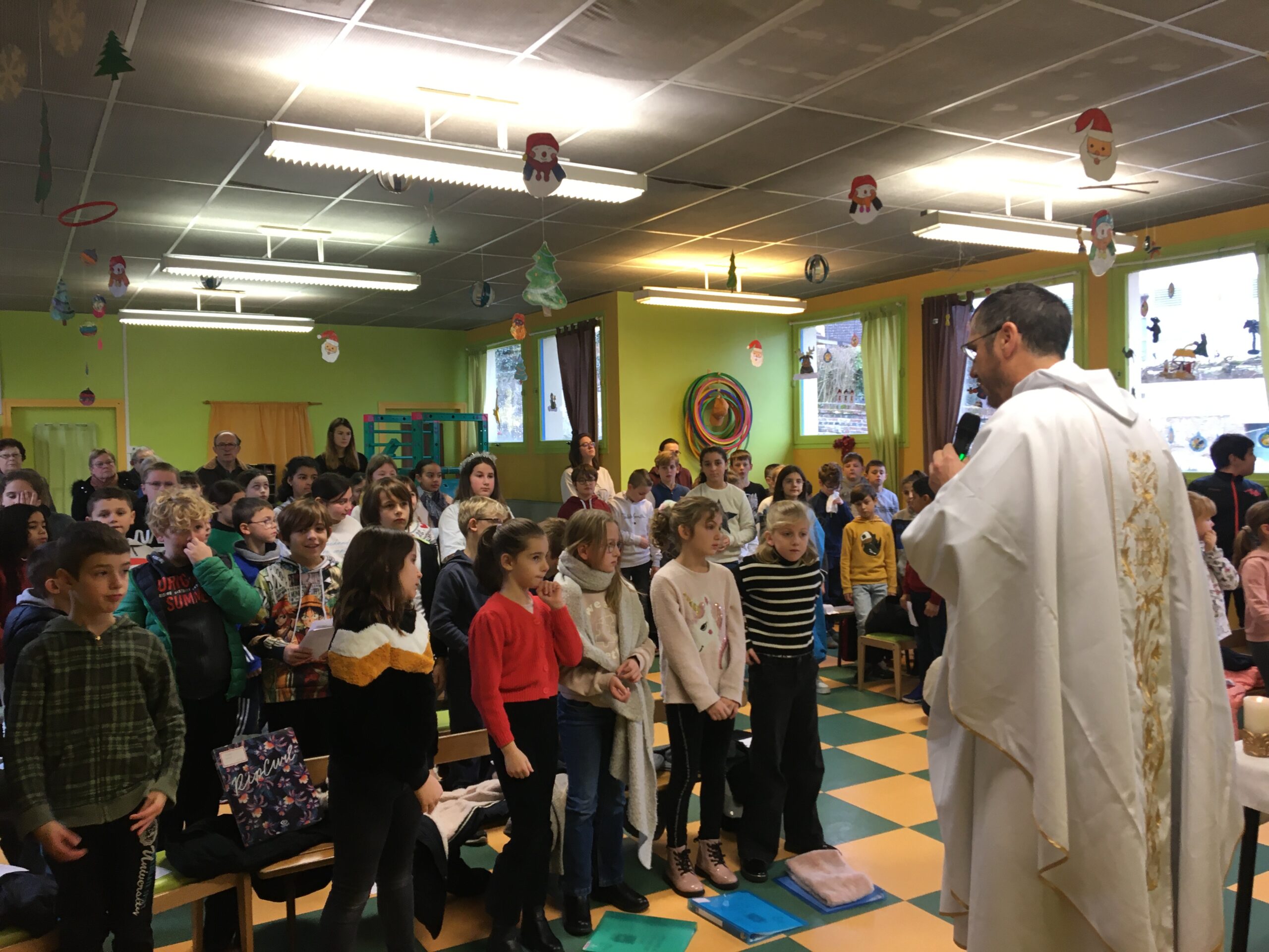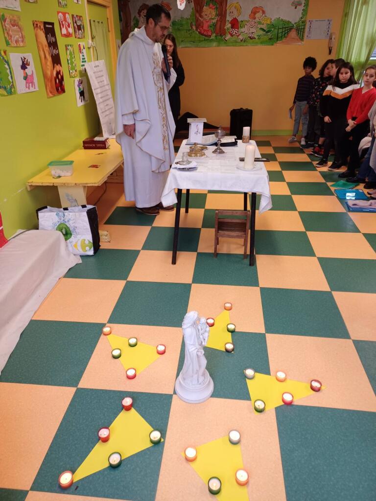 Jeudi 14 décembre, nous avons eu une messe à l’occasion de la fête de Marie qui a lieu normalement le 8 décembre. Le prêtre est venu à l’école pour célébrer la messe avec les élèves de CE2 et de CM. Nous avons fait une procession pour apporter des lumières qui ont été placées en étoiles autour d’une statue de Marie. Deux élèves ont aussi mimé l’évangile qui parlait de l’apparition de l’Ange Gabriel à Marie. Durant la messe, nous avons chanté des chants et récité des prières.