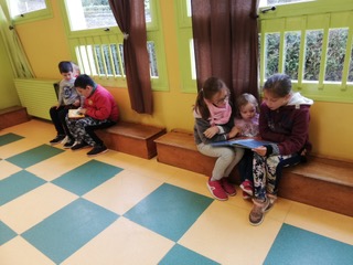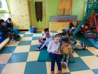 Tous les 15 jours les élèves de Cm1 vont lire un livre avec un enfant de la classe de TPS-PS de Viviane. Le début d’année demande de la patience pour les grands car les petits ont parfois peur …