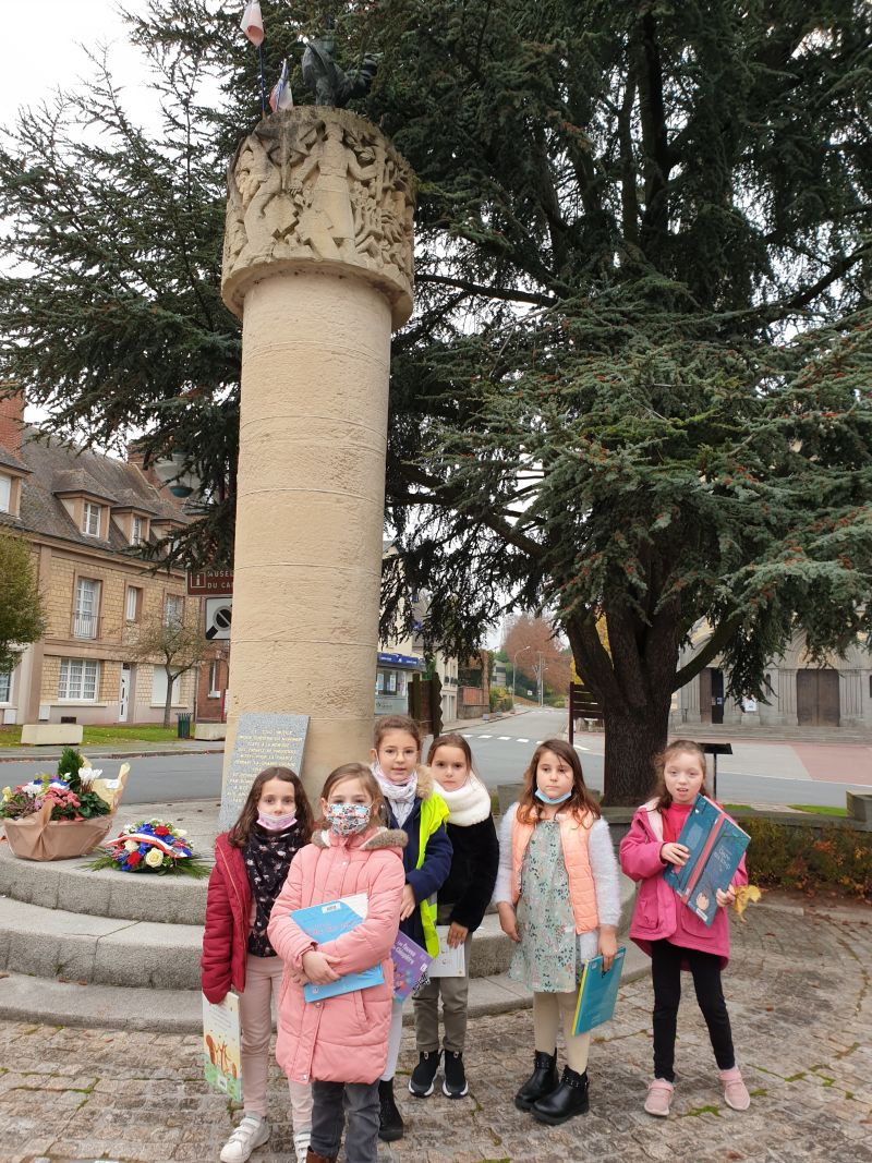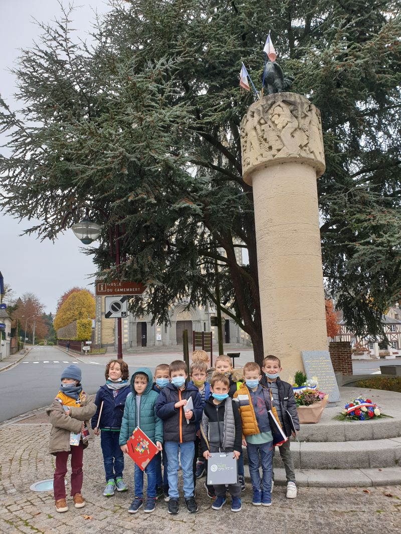 En repartant, nous sommes allés voir le monuments aux morts où ont été déposées des gerbes de fleurs à l’occasion du 11 novembre. C’est une date importante car on commémore la fin de la première guerre mondiale qui a fait tant de morts même à Vimoutiers !